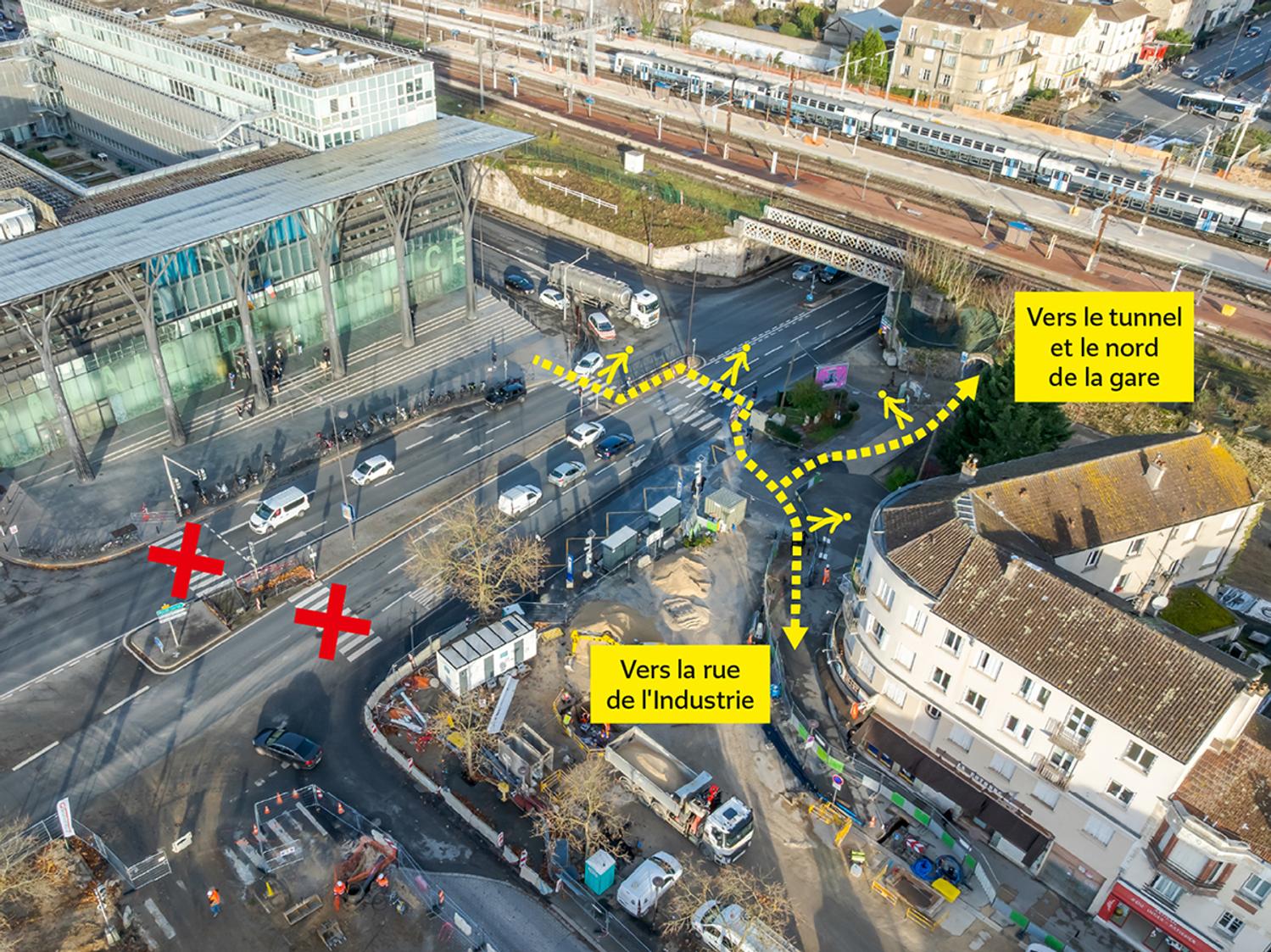 Pour rejoindre en toute sécurité l’arrêt de bus provisoire place de l’Ermitage depuis le tribunal, les usagers sont invités à emprunter le passage piéton le plus proche du tunnel.