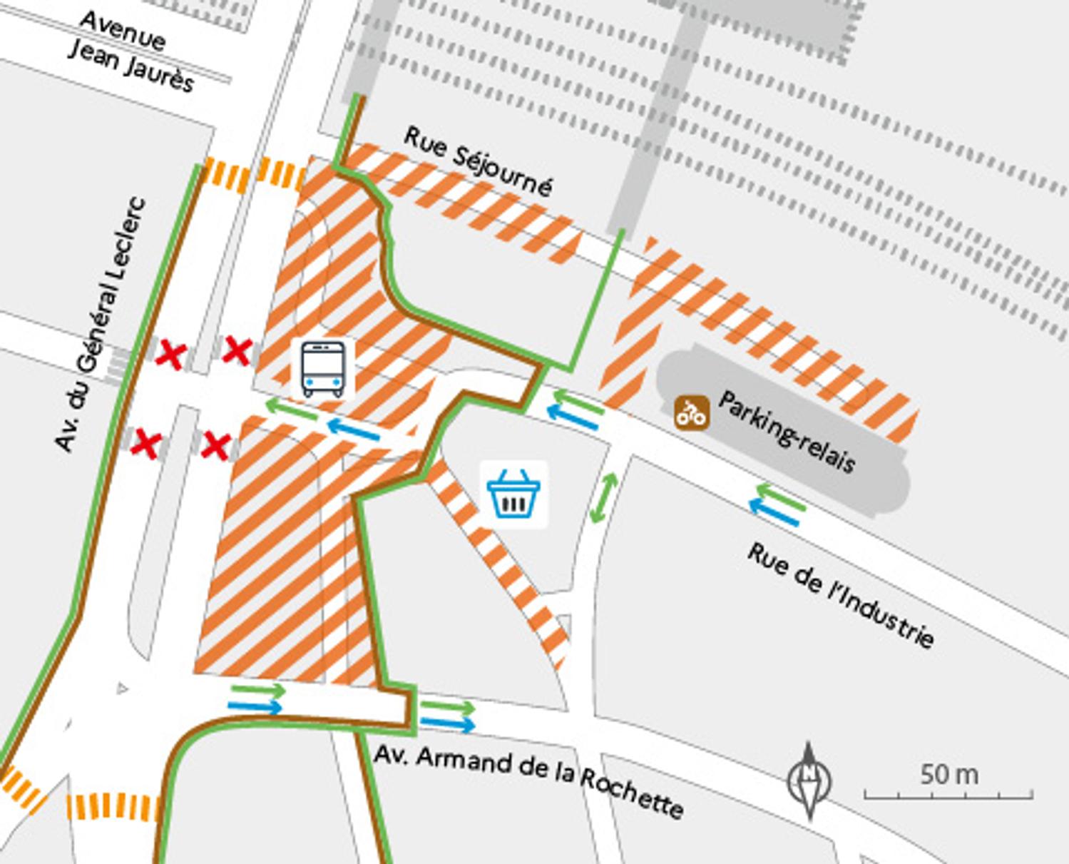 Les piétons et cyclistes circulant sur cette zone devront se reporter sur les itinéraires longeant la zone de chantier ou l’avenue Thiers (itinéraires verts et marrons ci-dessous).
