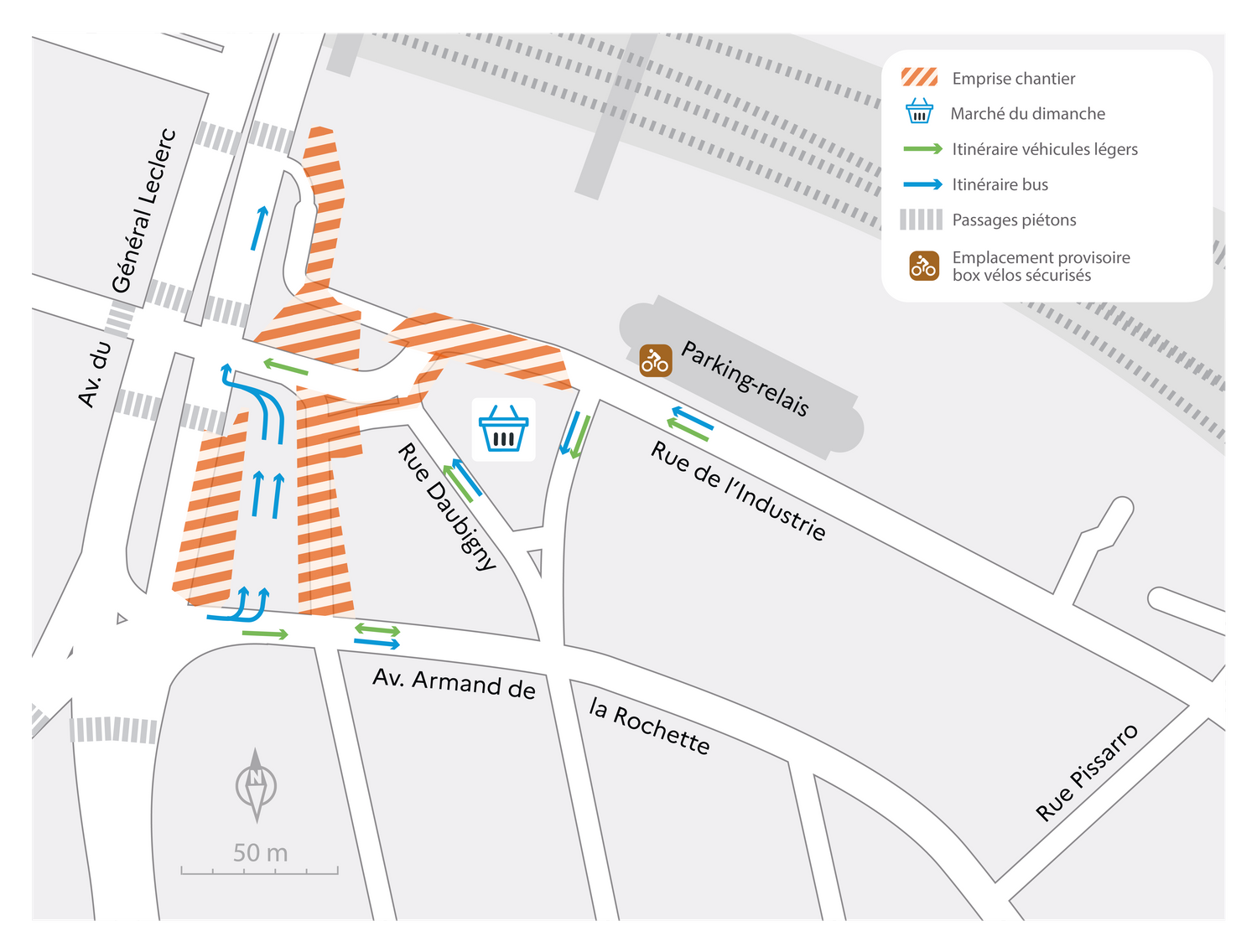 La gare et les commerces du secteur restent accessibles aux piétons et aux cyclistes via les itinéraires aménagés le long des emprises de chantier, indiqués par la signalétique sur place.
